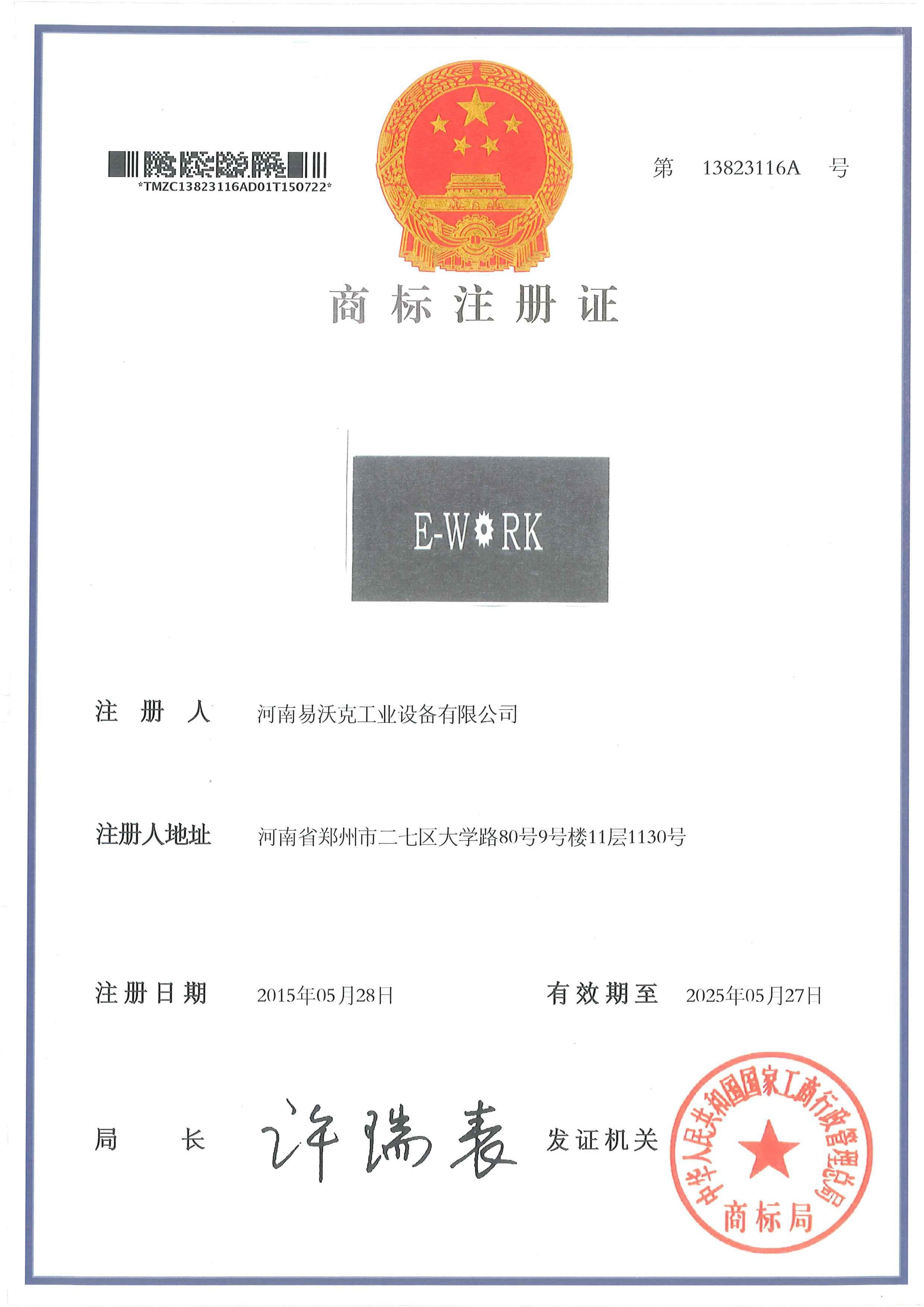 河南易沃克工業(yè)設(shè)備有限公司,公司注冊商標(biāo)為“E-WORK”,有國家工商行政管理局商標(biāo)局頒發(fā)的商標(biāo)注冊證( 13823116A號),是有效的、是合法的。